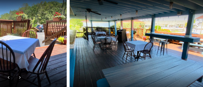 The menu includes a mixed grill, seafood, and children’s options. Join them on their outdoor deck to try our signature crabcakes.